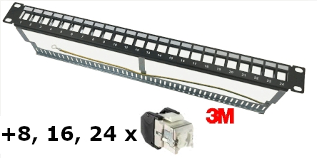 Pack composé d''un panneau de brassage 24 ports à monter dans un coffret ou une baie 19 pouces pour la mise en place des noyaux RJ45 au format 3M, accompagné des embases RJ45 Catégorie 6.