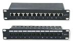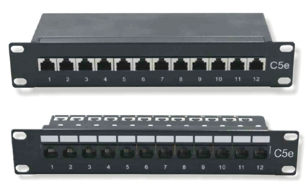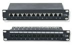 Cat 5e SANS écran - >Panneau de brassage 10 pouces noir équipé de 12 ports RJ45. Sérigraphie en face avant. Categorie 5e conforme à la norme ANSI/TIA/EIA 568 B.2. Excellentes caractéristiques mécanique grâces à la fixation de chaque cable par collier sur la partie arrière. Cablage de type T568A ou T568B avec l'outil de type Krone. Le montage dans le coffret nécessite 4 vis non fournies.
