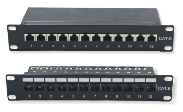 Cat 6 AVEC écran - >Panneau de brassage 10 pouces noir équipé de 12 ports RJ45. Sérigraphie en face avant. Catégorie 6 conforme à la norme ANSI/TIA/EIA 568 B.2. Excellentes caractéristiques mécaniques grâce à la fixation de chaque cable par collier sur la partie arrière. Câblage de type T568A ou T568B avec l'outil de type Krone. Le montage dans le coffret nécessite 4 vis non fournies.