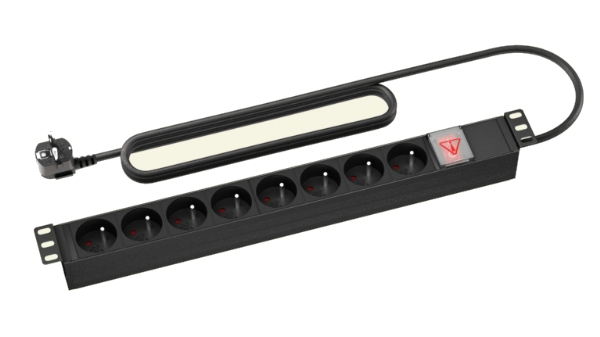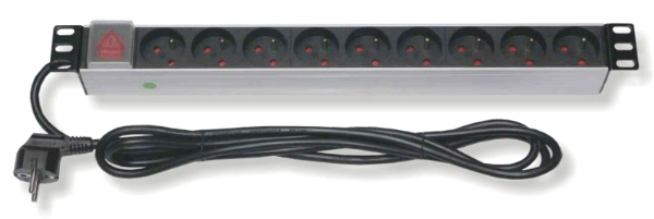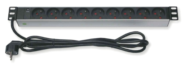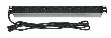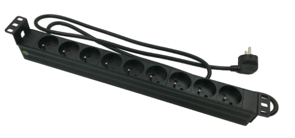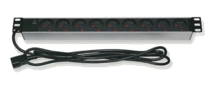 9 PC - >PDU 1U avec interrupteur lumineux, avec câble 1,5 mm2 de 2,30 m doté d'une prise française, 16A/250V. Dimensions : 482.6 x 44.4 x 44,4 mm. Disponible en 9 PC françaises 2 plots + terre. Entrée : 1 Prise française male 2P+T, norme CEE 7/5, type E Sortie : 9 Prises françaises 2P+T, norme CEE 7/5, type E