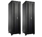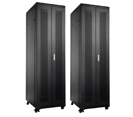 42U - 1985 mm - 800 x 800 mm, Porte AV perforée, porte AR double perforée - >Caractéristiques : Armoire informatique montée Porte avant: vitrée et ventilée, avec serrure Porte arrière: métal plein, avec serrure Panneaux lateraux amovibles avec verrouillage par clips et serrure Portes très facilement démontables (amovibles) Passage de cable bas et haut Baie de brassage de 800 mm de large équipée de goulottes latérales 4 montants 19 pouces (2 avants, 2 arrières) réglables en profondeur par pas de 25mm Vérins réglables fournis, kit roulettes en option (Réf. E806A2037 Voir ci-dessous) Kits de visserie fournis : (un kit = 1 vis + 1 rondelle + 1 écrou cage) 22U, 24U et 27U: 20 kits fournis37U : 30 kits fournis 42U : 40 kits fournis Kit de mise à la terre à commander séparément Conditionnement : Baie montée sur palette, avec protections renforcée des angles et le tout filmé.