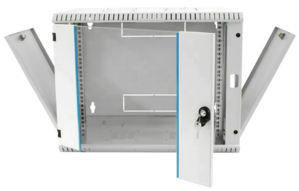Assemblage robuste par soudure Coffret auto ventilé Peinture en poudre cuite au four Coloris RAL 7035 Gris Clair Porte avant en verre Securit, démontable Sens d'ouverture de la porte inversable, à droite ou à gauche Ouverture de la porte sur 180° Porte fermant à clef Panneaux latéraux, avec un côté amovible facilitant l’accès aux équipements Panneaux latéraux dotés de serrures