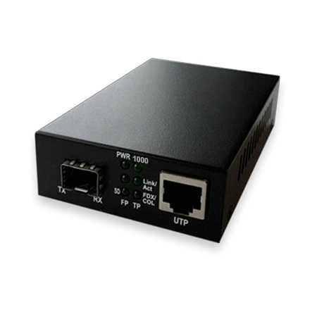 1 port Ethernet 1000Base 1 emplacement pour module SFP mini GBIC Indicateurs lumineux en face avant. Bloc d'alimentation 5 Volts fourni Dimensions : 70 x 90 x 26 mm