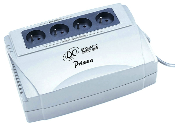 Caractéristiques des Onduleurs Dequatec série Prisma | Référence | Capacité | Puissance | Prises ondulées | Protection surtensions | L x H x P | Poids | Total Prises |
