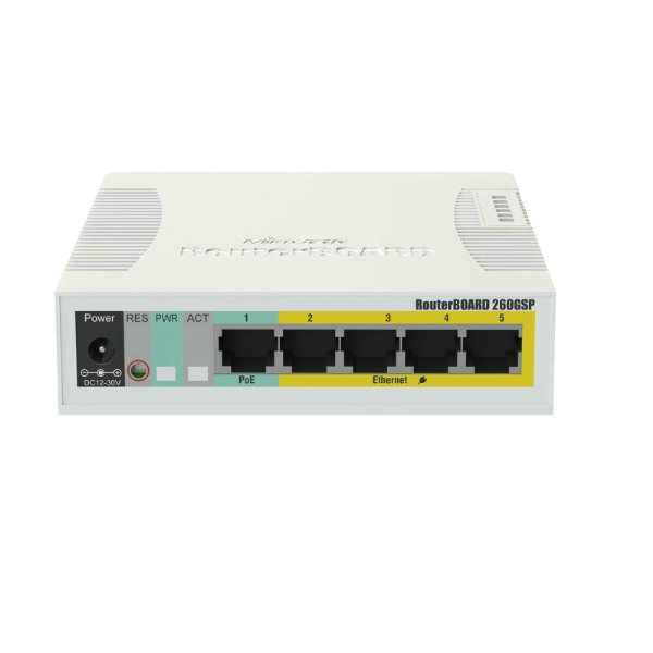 Le RB260GS (CSS106-5G-1S) est un petit commutateur SOHO. Il dispose de 5 portsGigabit Ethernet et d'une cage SFP alimentés par une puce de commutation Atheros.