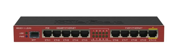Le RB2011iL-IN est le modèle le plus basique, avec 5 ports Ethernet Gigabit, 5 ports Fast Ethernet, prise d'alimentation et prise en charge PoE.